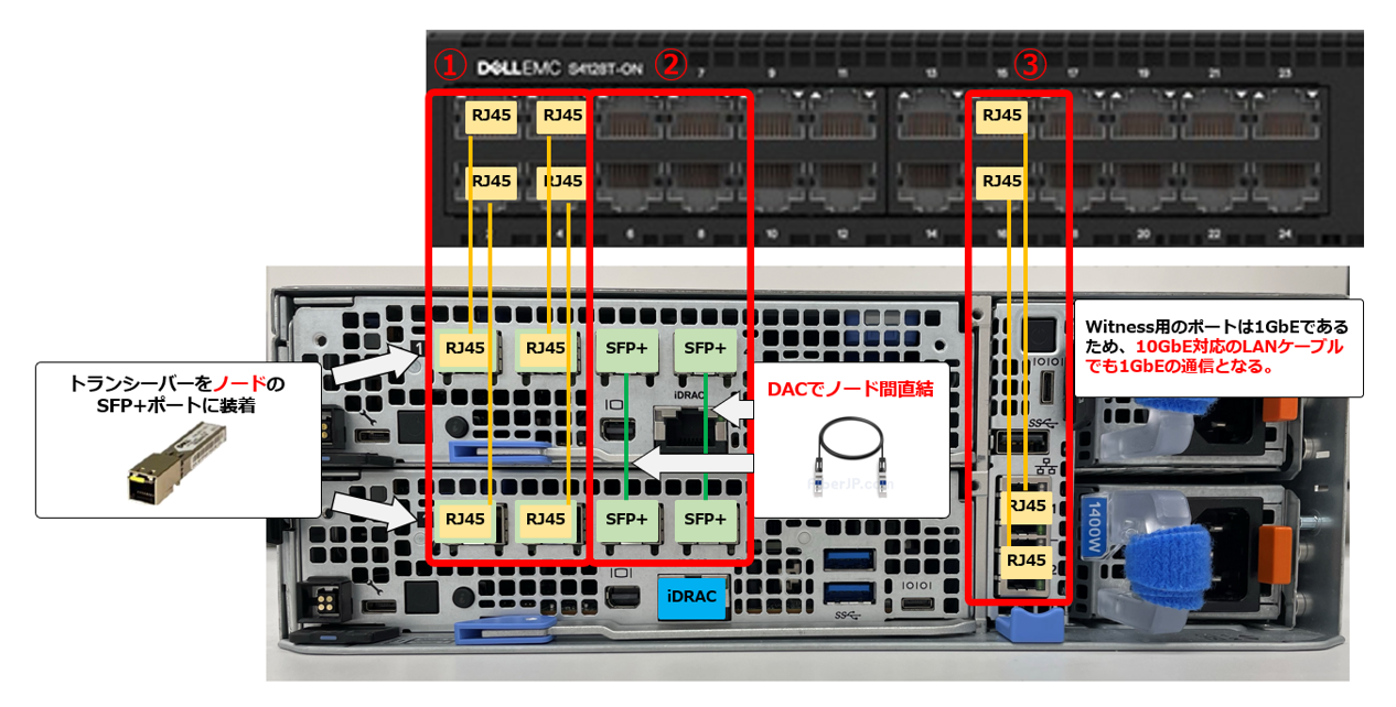 ToRスイッチがSFP+タイプの場合は、ノードとToRスイッチをDACケーブルで接続します。一方で、WitnessはToRスイッチ側にトランシーバーを装着し、ノード⇔スイッチ間をLANケーブルで接続します。