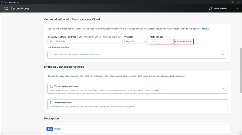 有効化できるのは「Communication with Secure Access Cloud」の項目でTCPプロトコルの単一ポート番号を選択した場合のみとなります。