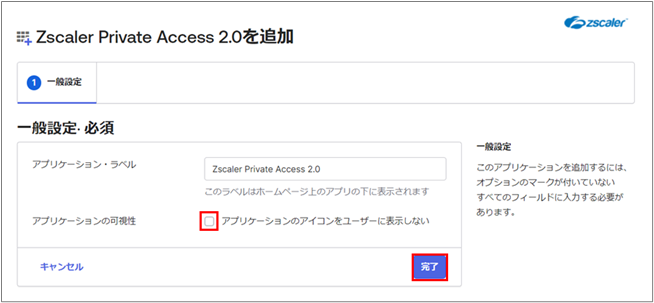 ⑤「アプリケーションの可視性」にチェックを入れ、「完了」をクリックします。