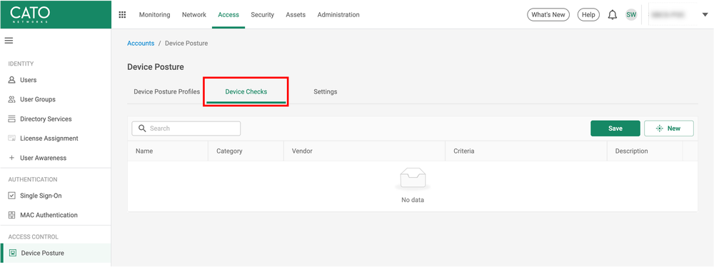Access > Device Posture > Device Checkからデバイスチェックのオブジェクトを作成します。