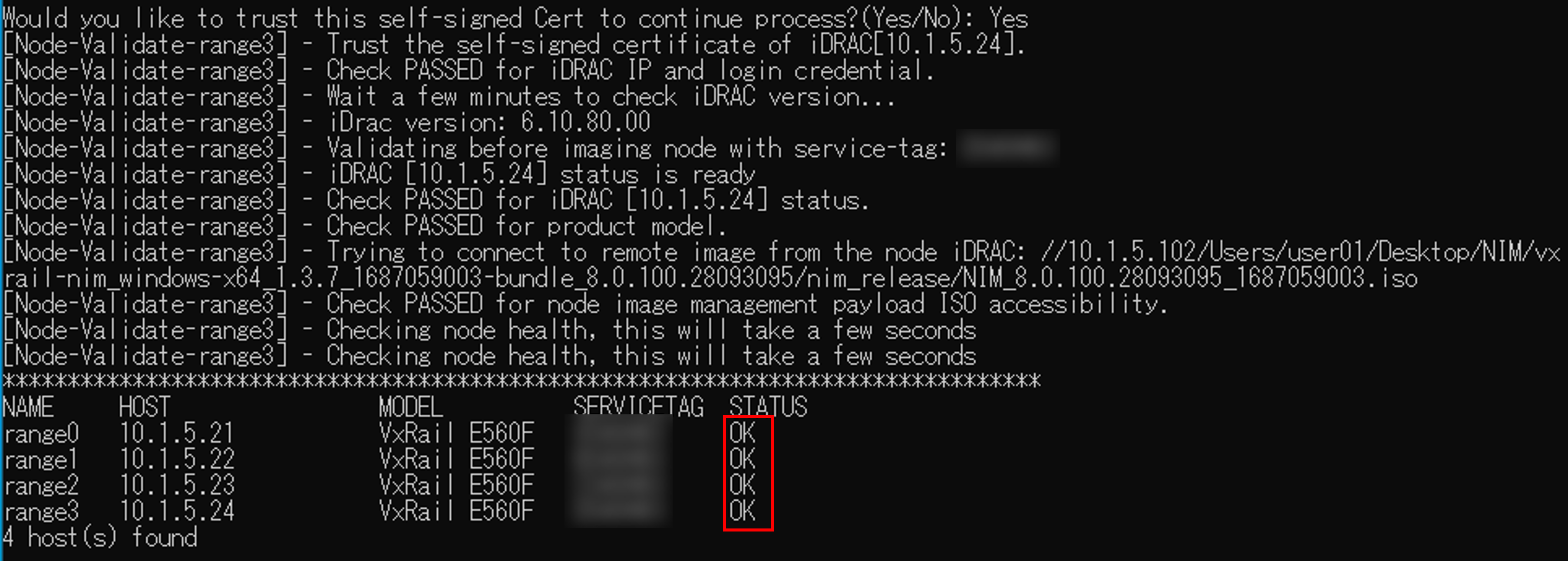 自己証明書を信頼するかどうかについては [Yes] のままEnterを押します。するとひとつめのノードから検証が始まります。検証がPASSしたら残りのノード分も繰り返し行います。