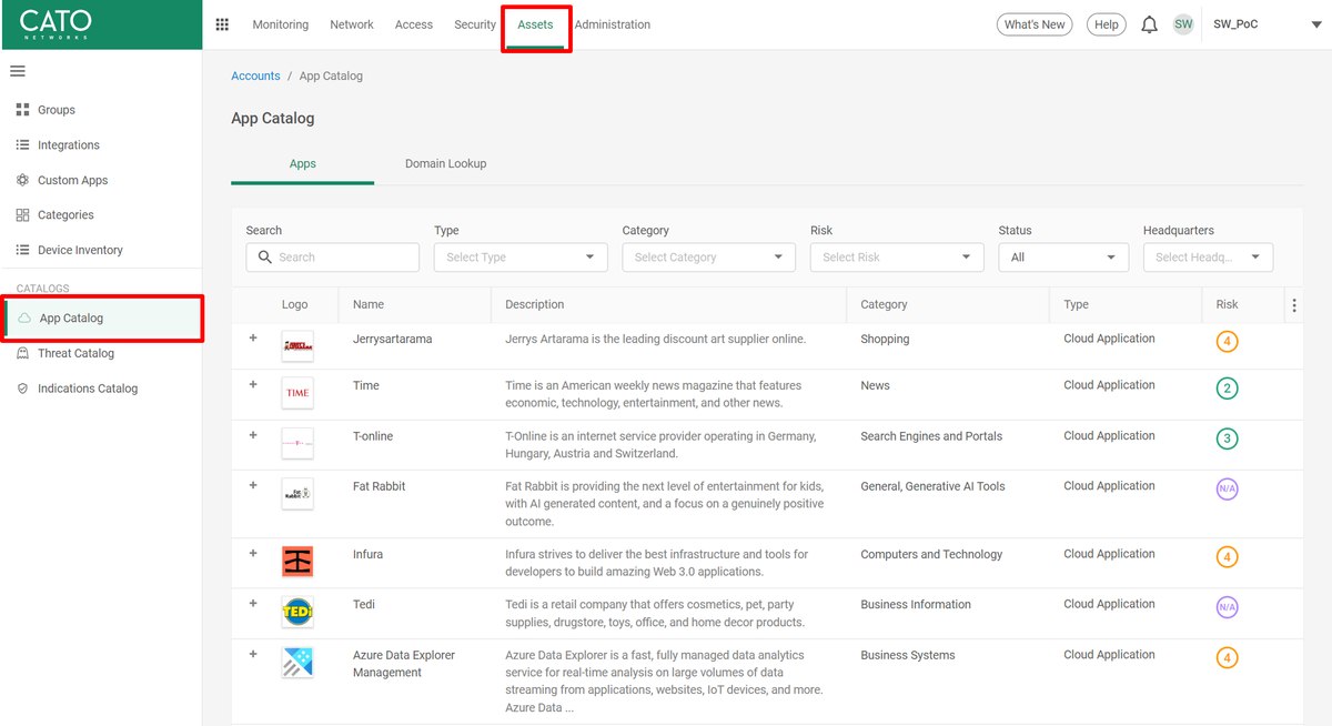 Cato Networksがオブジェクトとして定義しているWebサイト、アプリケーション、サービスの情報を閲覧できます。