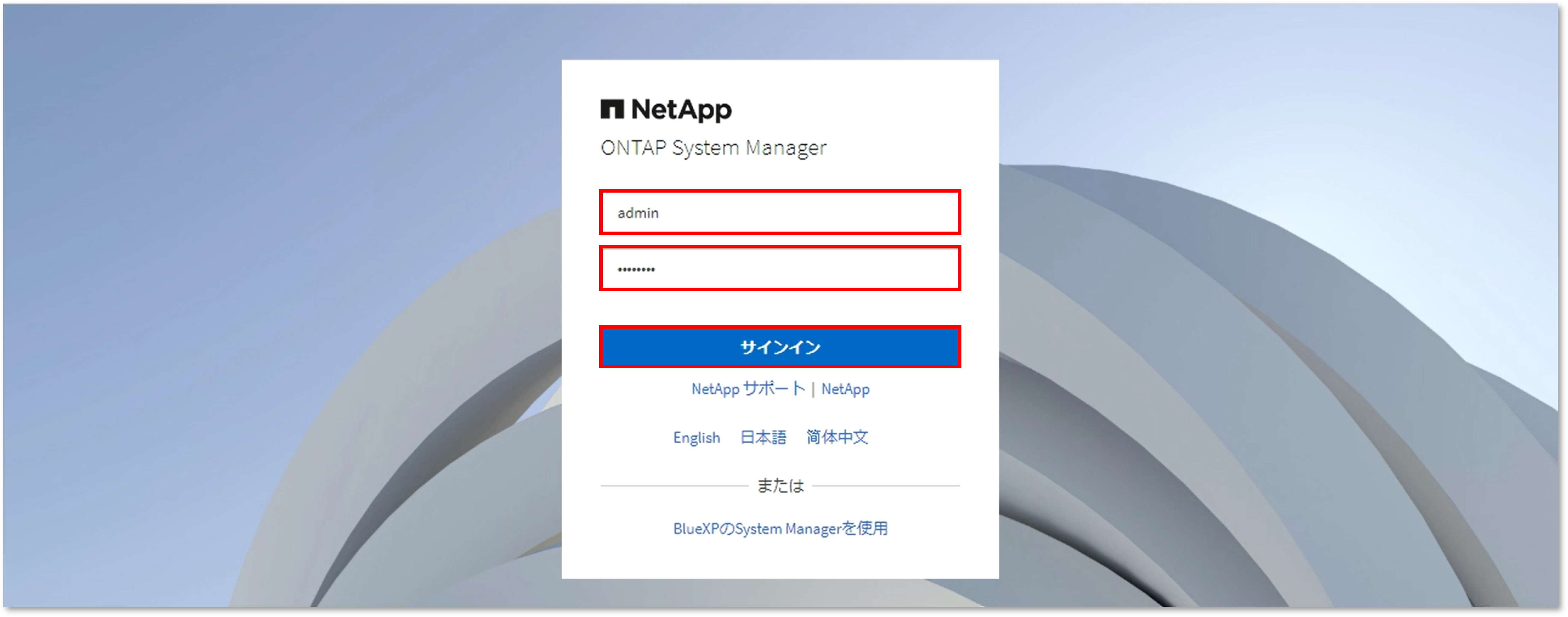 この時、ストレージ内のデータはフェイルオーバーされノード単位でバージョンアップが行われるため、クライアントからのデータアクセスは遮断されず、システムの運用を継続することが可能です。 - バージョンアップが完了すると、System Managerのサインイン画面が自動的に立ち上がります。