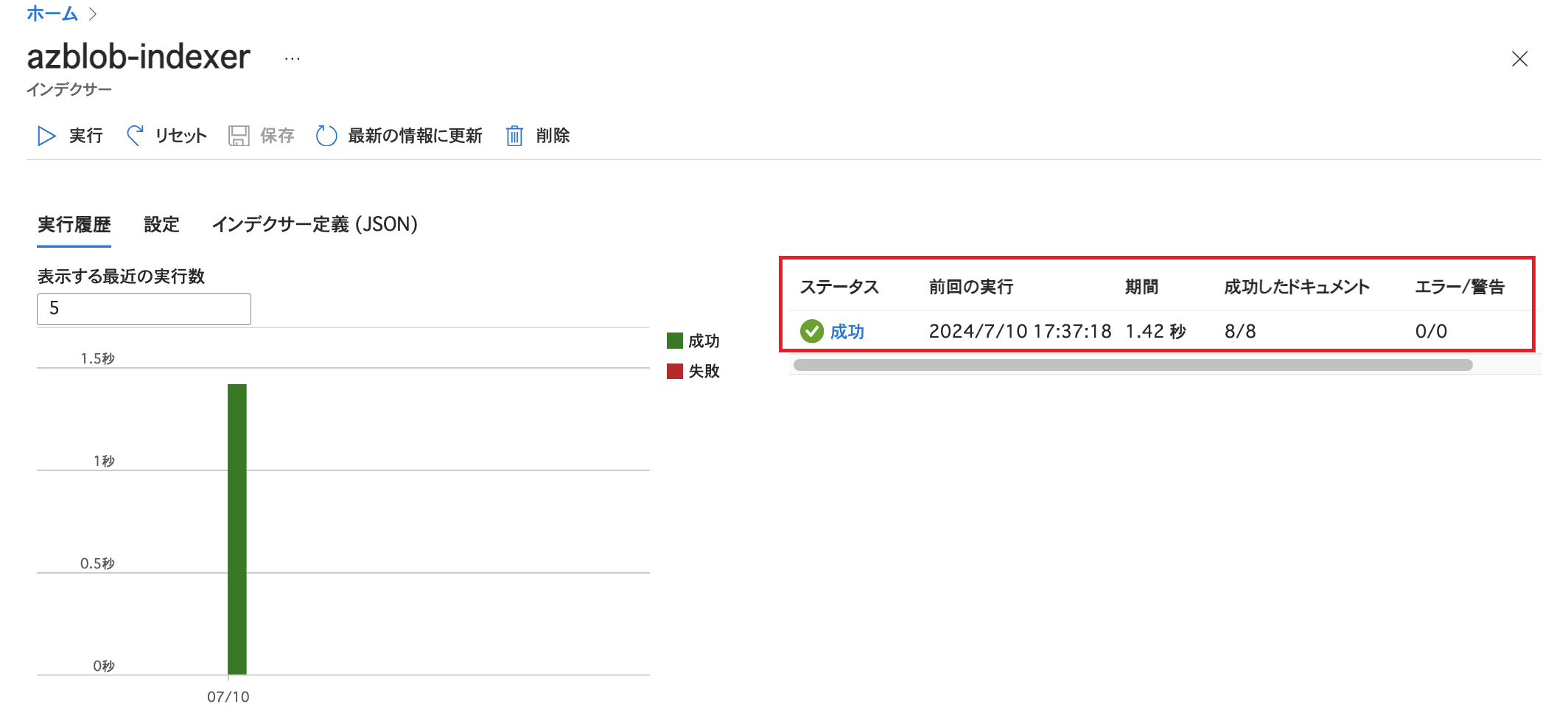 インデクサーの実行が完了すると以下のような画面になります。 ステータスが「成功」になっていることを確認します。 また、今回利用したCSVファイルは1点のみですが、「成功したドキュメント」の数が8になっています。 これはインポートしたCSVファイルに8つのアイテムの情報が記載されており、これを解析モード「区切りテキスト」としてインデクサーを実行したためです。