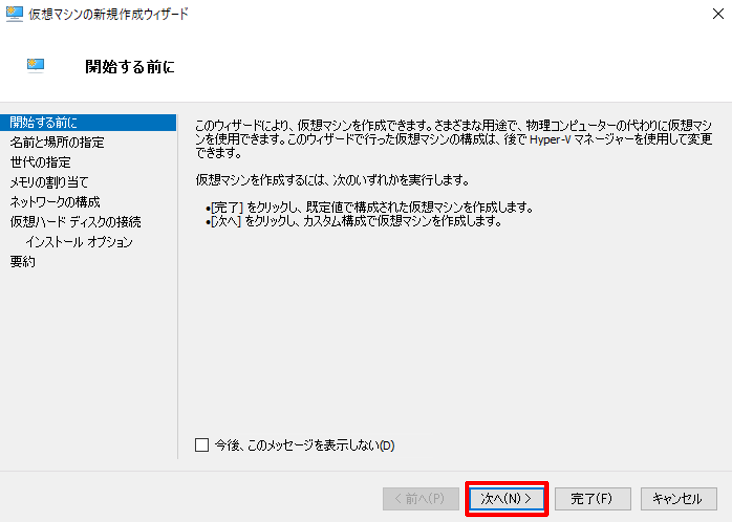 ※仮想マシンの世代の違いによる相違点は複数ありますが、仮想マシンのセキュリティやパフォーマンスが向上する第2世代を選択することをおすすめします。相違点についてはMicrosoftの説明をご覧ください。