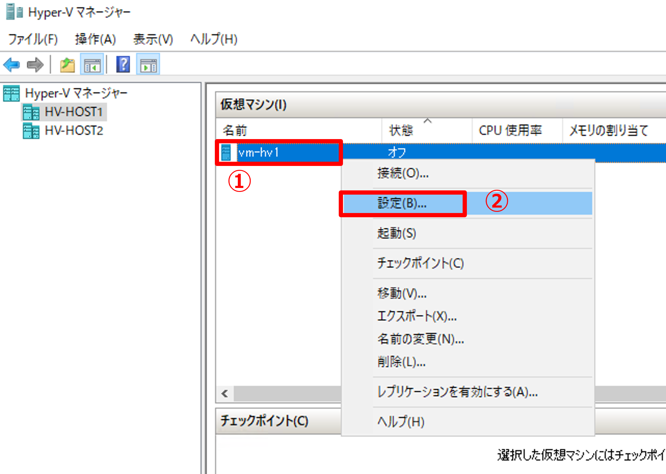 2. Hyper-Vホスト1(hv-host1)で「仮想マシンの新規作成ウィザード」を起動します。