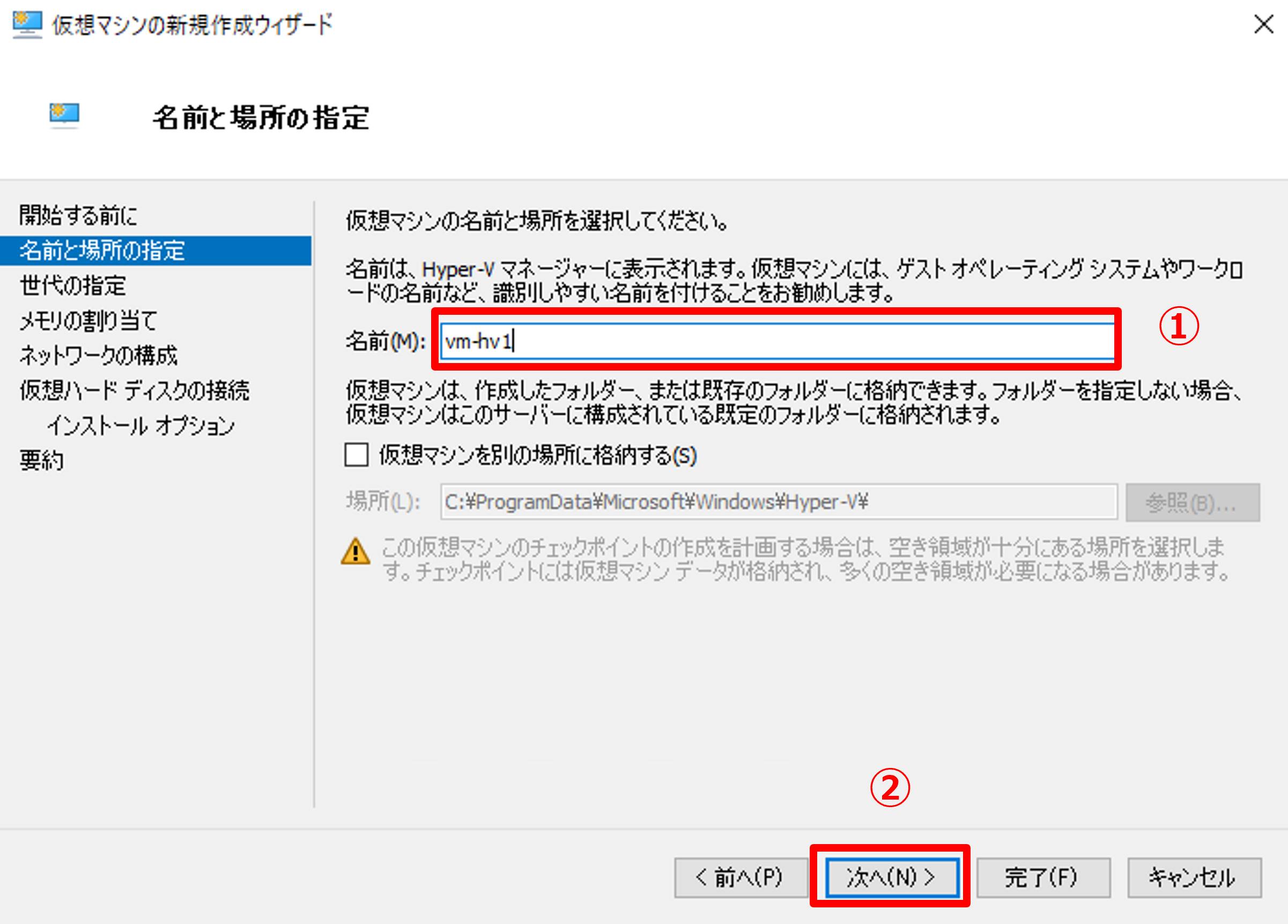 ※本環境では [vm-hv1] と入力しています。 - [次へ] をクリックします。