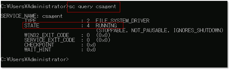 ・コマンドプロンプトから確認する場合は、"sc query csagent" コマンドを実行します。