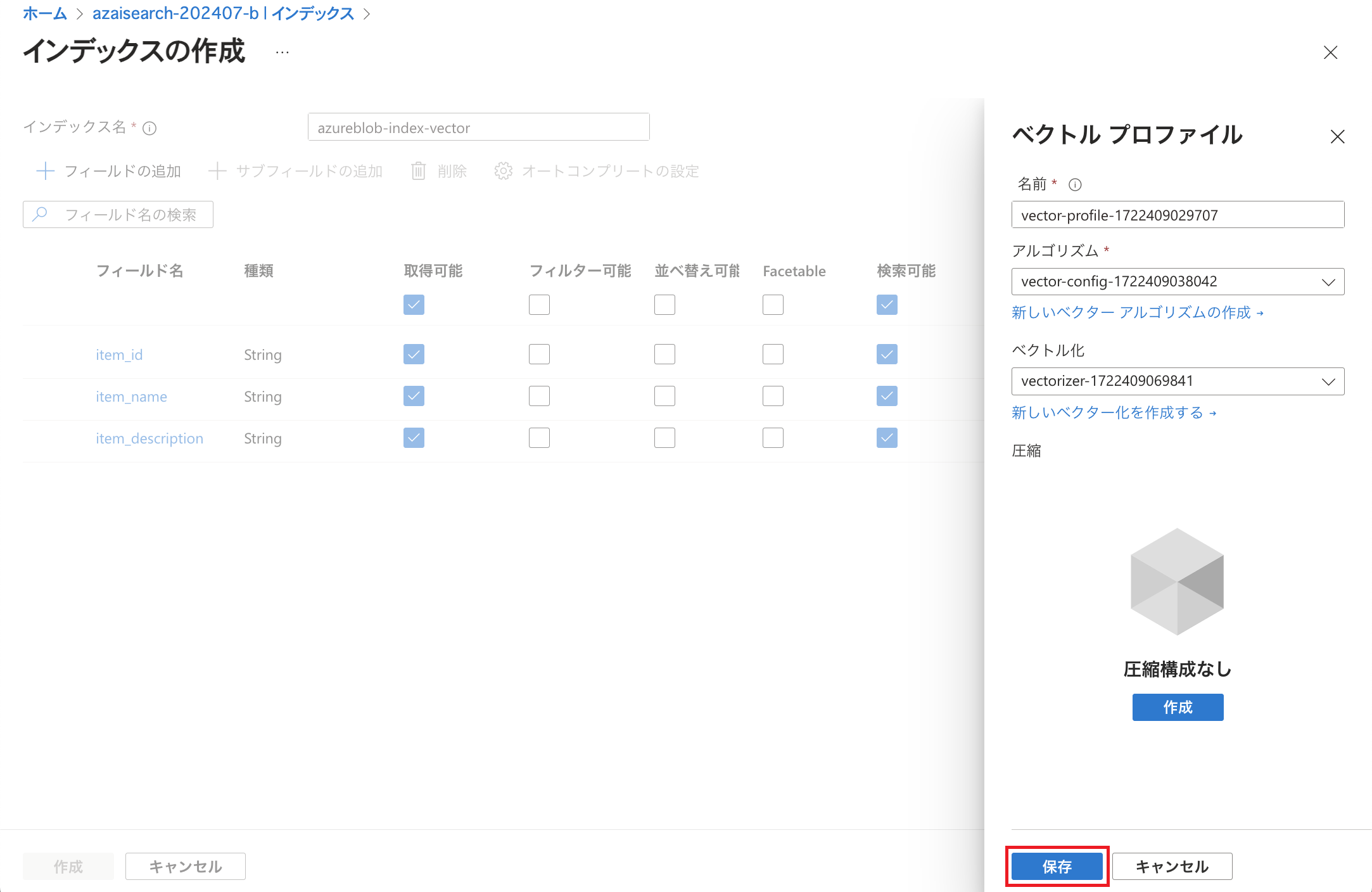ここではベクトル検索のためのアルゴリズムを設定します。 Azure AI Searchのベクトル検索プロファイルでは「Hierarchical Navigable Small World (HNSW)」や「完全なKニアレストネイバー (KNN)」といったアルゴリズムを選択できるようになっており、ここではHNSWを設定しています。 ここでは各Kindパラメーターの値をデフォルトのまま「保存」しています。(各パラメーターについてはこちらで説明されています。)