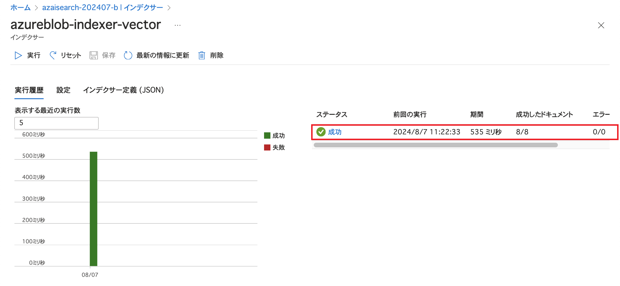 インデクサーの実行が完了したのち、ステータスが「成功」になっていることやエラー / 警告が発生していないことを確認します。