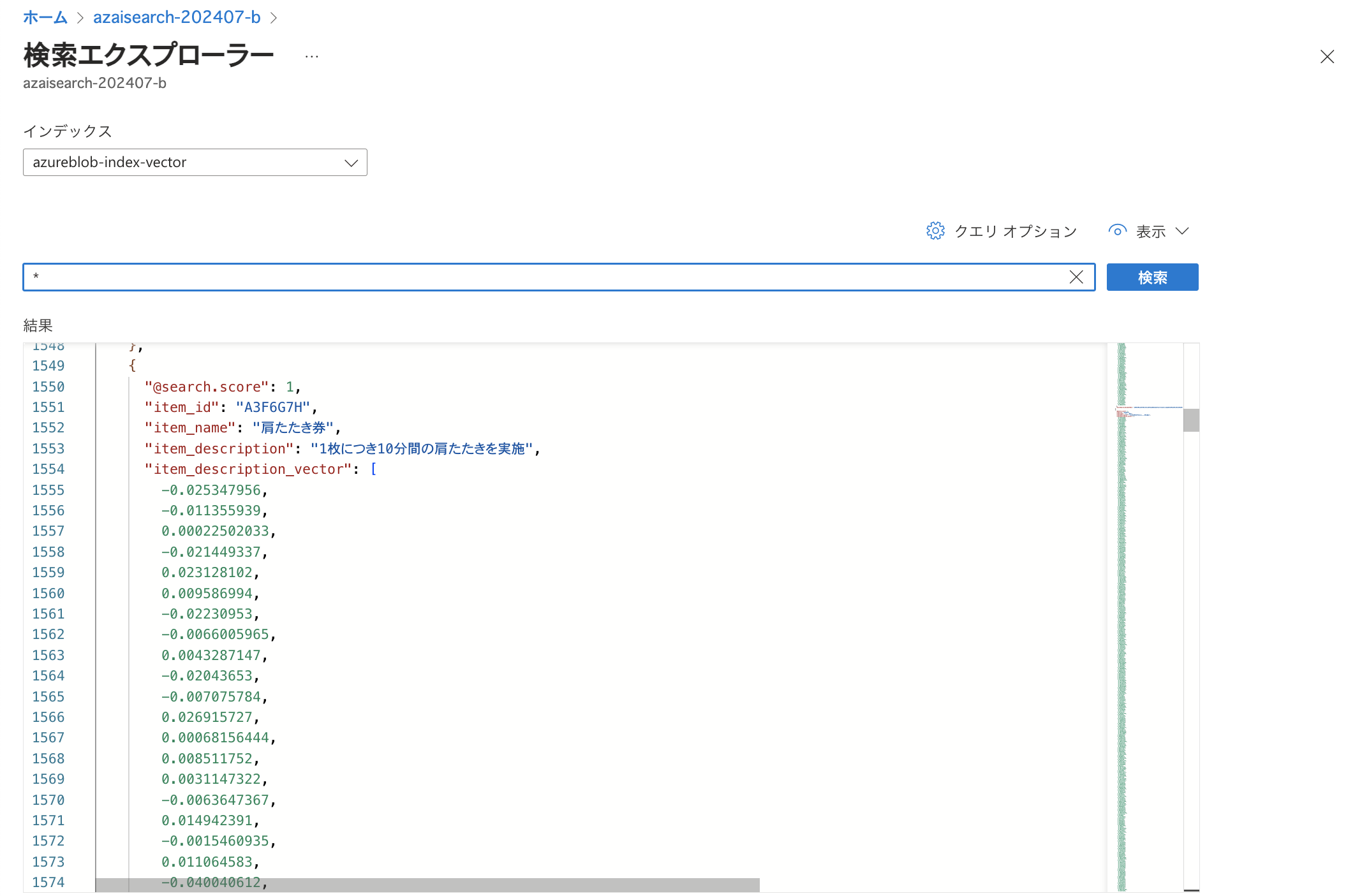 インデックスにデータ(ドキュメント)が格納されましたので、Azure AI Searchの検索エクスプローラーを利用して確認を行います。