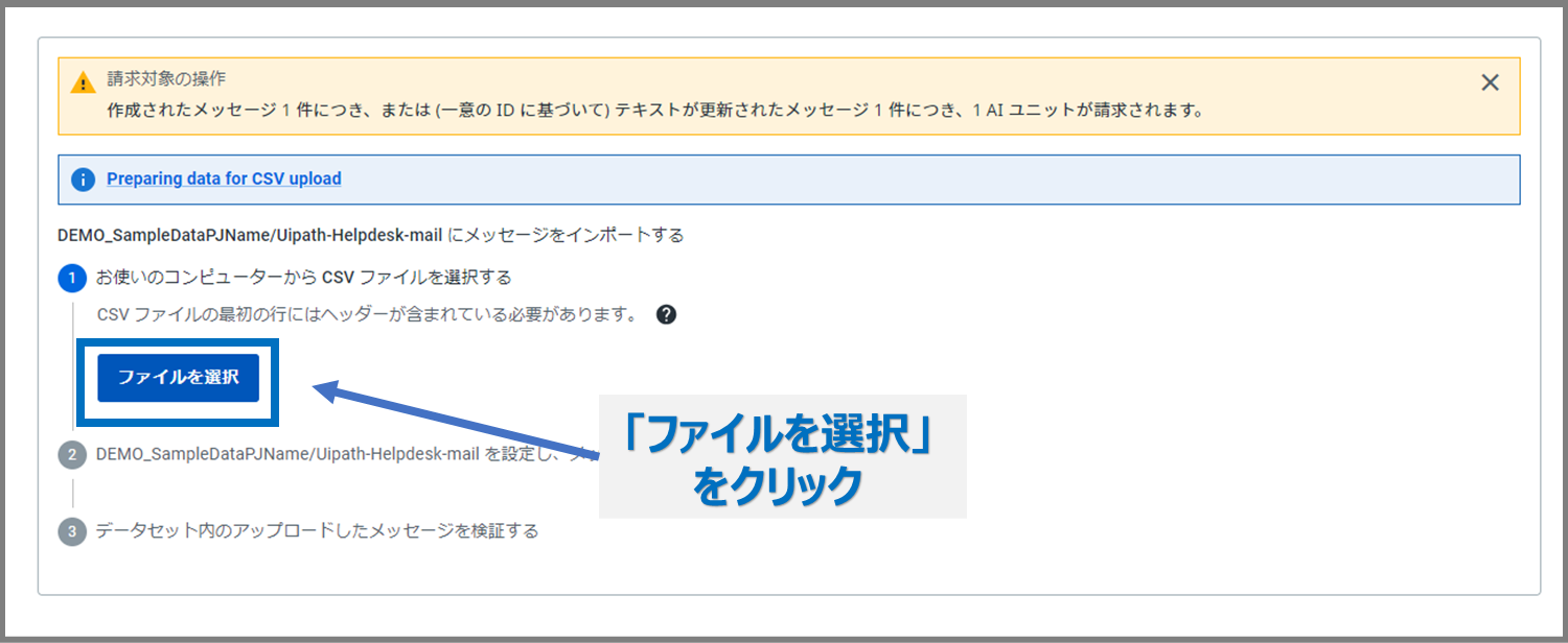 ここでデータをアップロードする時にAIユニットが消費されます。