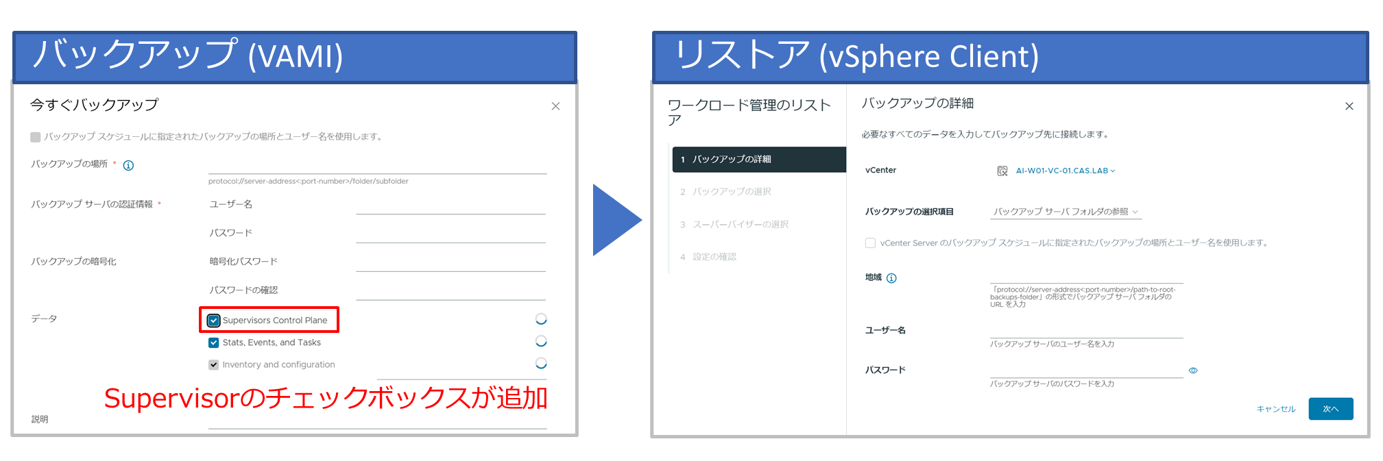 バックアップはvCenter Serverの管理インターフェイス (VAMI)から行い、リストアはvSphere Clientのワークロード管理から実施できます。