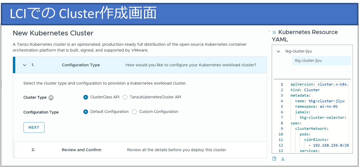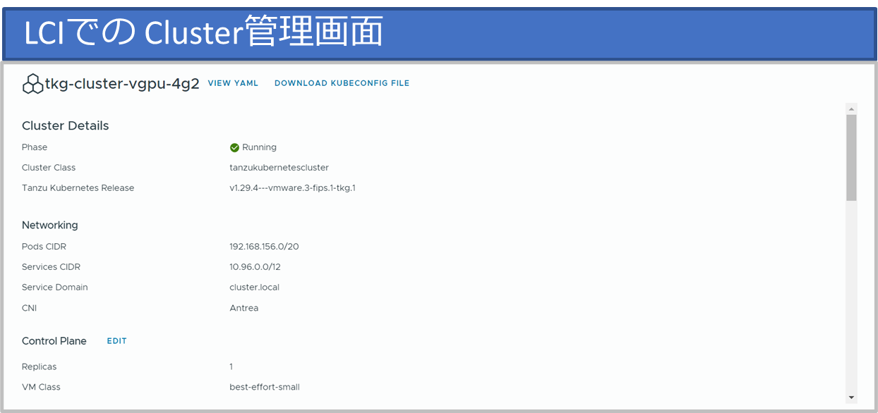 例えば、TKG Clusterの作成や可視化、TKG Cluster上で動作するVolumeやServiceの可視化が実現できます。また、展開済みのTKG Clusterへリクエストを送るためのkubeconfigも、LCI上から取得できるようになります。