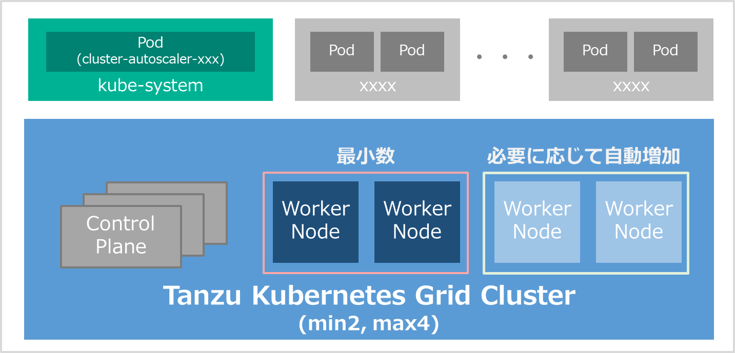 TKG Cluster のワーカーノードの、自動スケールアウト (増加) およびスケールイン (削減) が可能になりました。これにより、使用状況に応じてクラスタ内のワーカーノード数を自動的に調整できるようになります。
