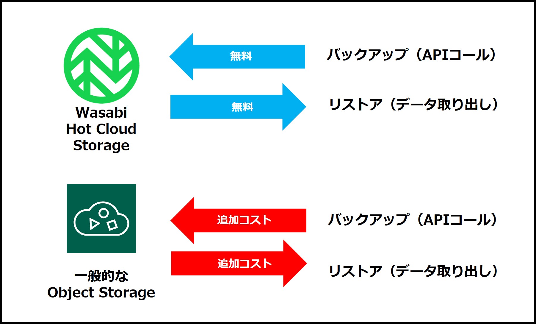 一般的なObject Storageはデータの取り出し(egress)に追加コストが発生するため、リストア時に想定外のコストが発生する場合がありますが、「Wasabi Hot Cloud Storage」はデータの取り出しに追加コストがかからないという点も大きなメリットになります。追加コストを意識することなく定期的なリストア試験などを実行可能です。