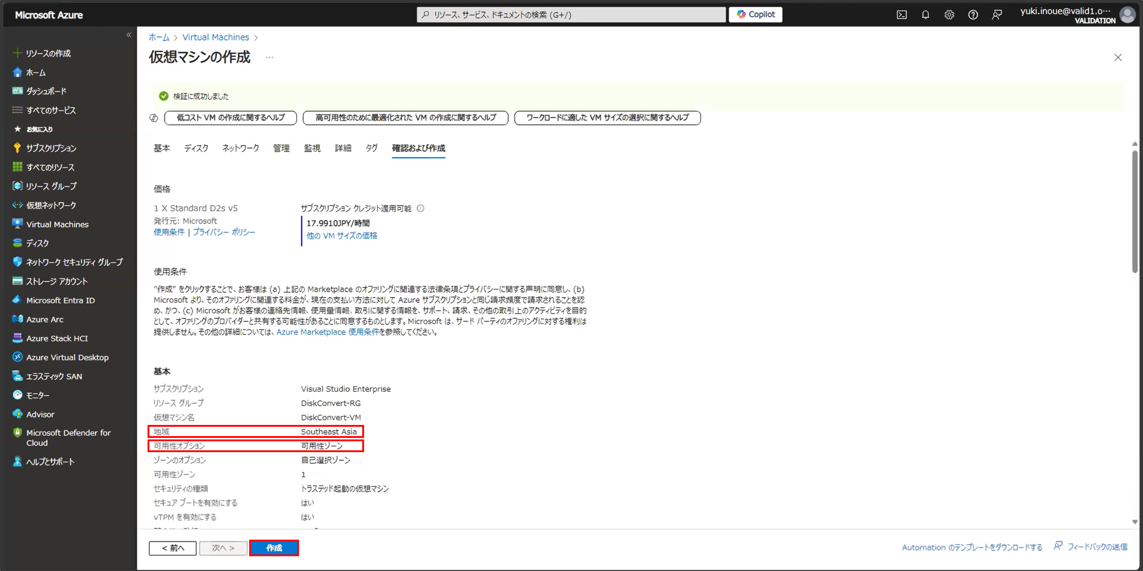 今回はPremium SSD v2をデプロイ可能かつディスクの直接切り替え機能に対応した「東南アジア」リージョンに仮想マシンをデプロイします。