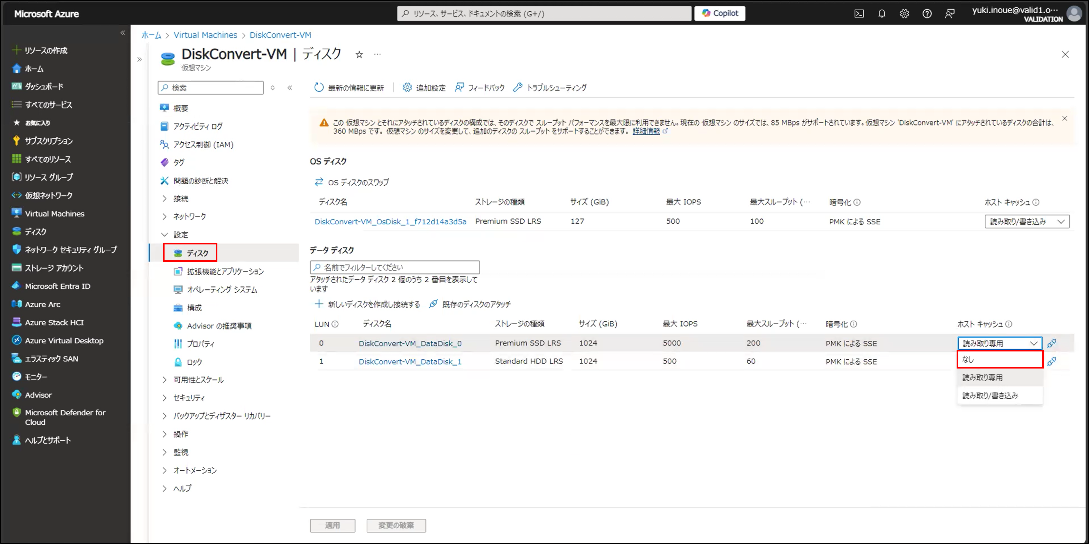 - 既存のディスクがホストキャッシュを使用している場合、事前に無効化が必要