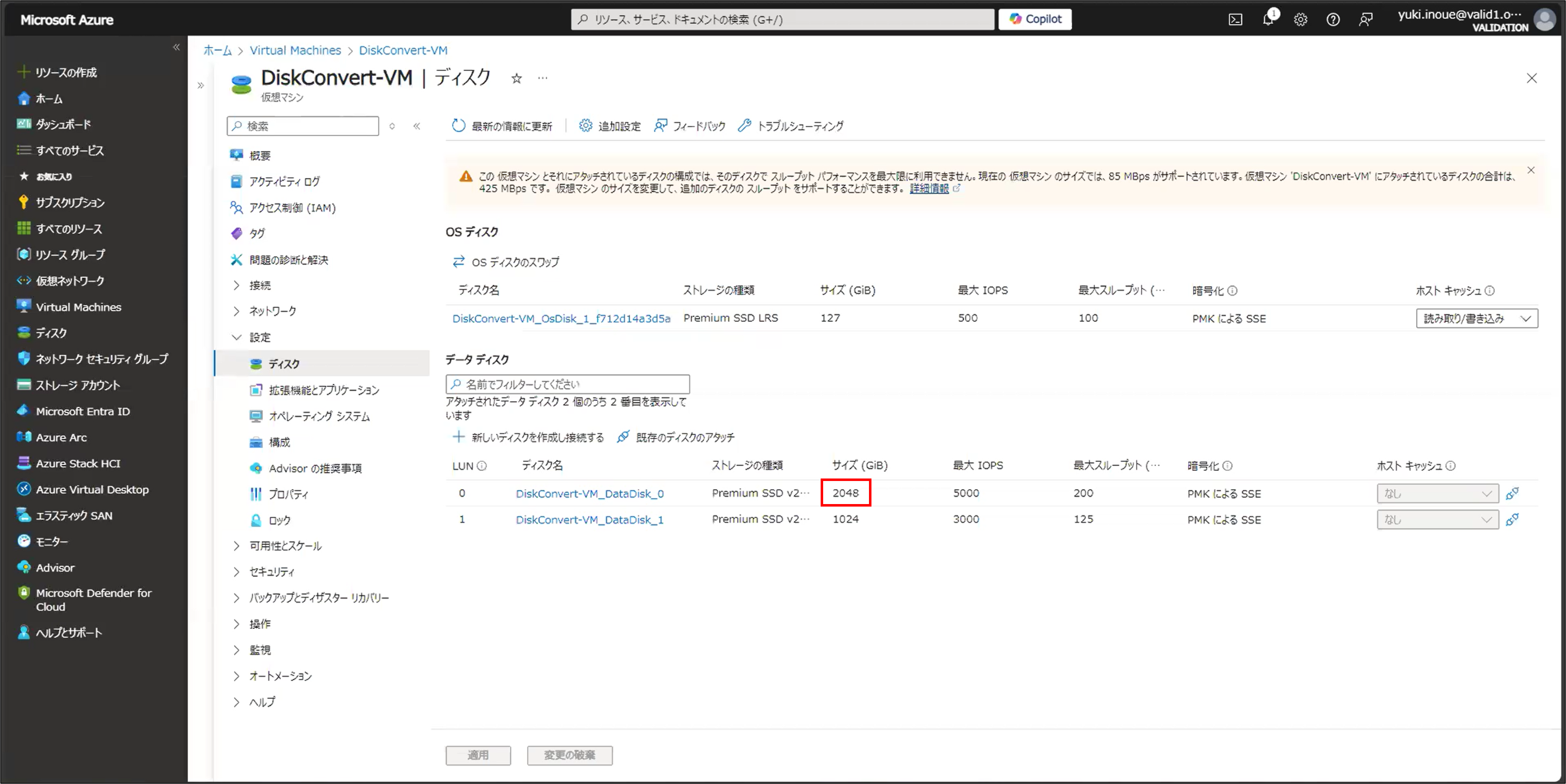 仮想マシンに接続されているもう1つのStandard HDDのデータディスクも同様の手順でPremium SSD v2に直接切り替えることができます。