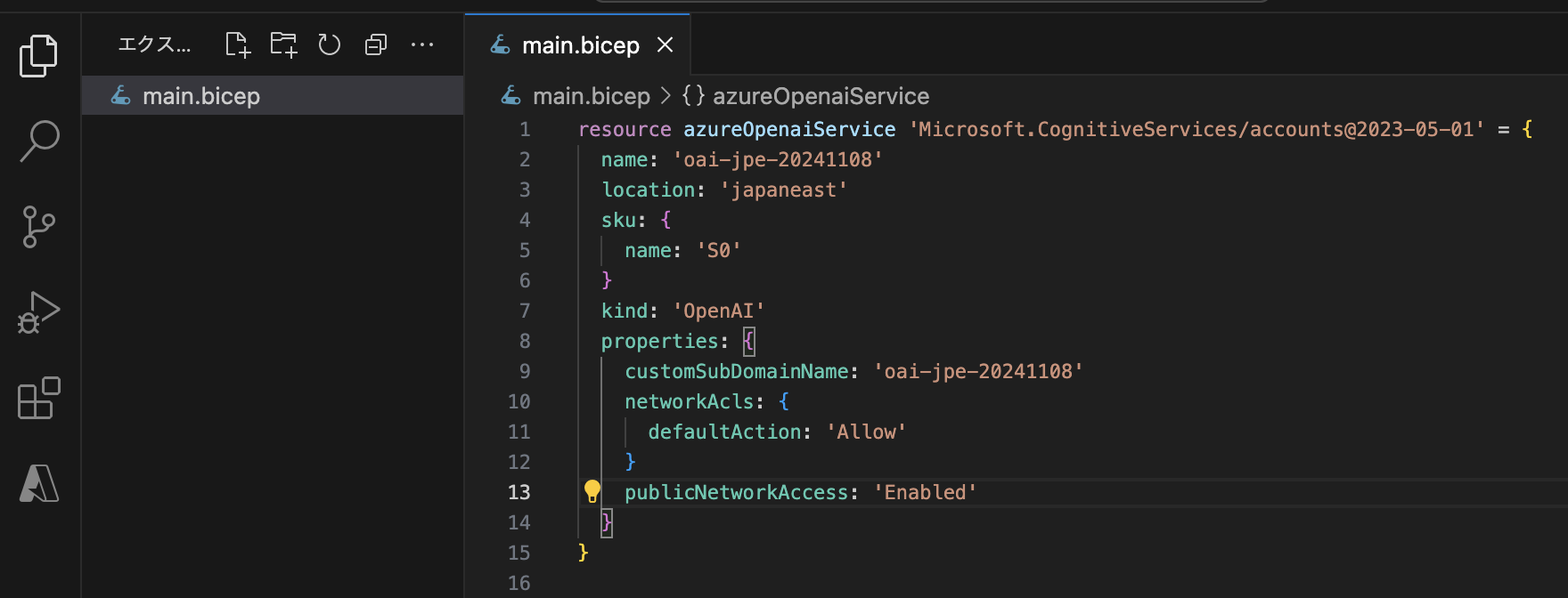まずはBicepファイルを作成します。 ここではmain.bicepというファイルを作成し、以下のような内容を記述しました。