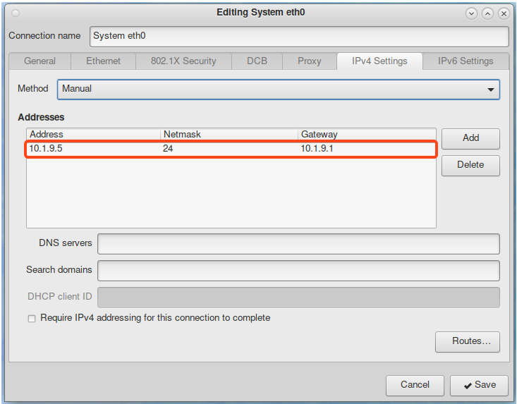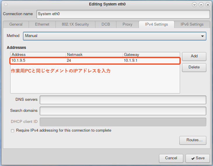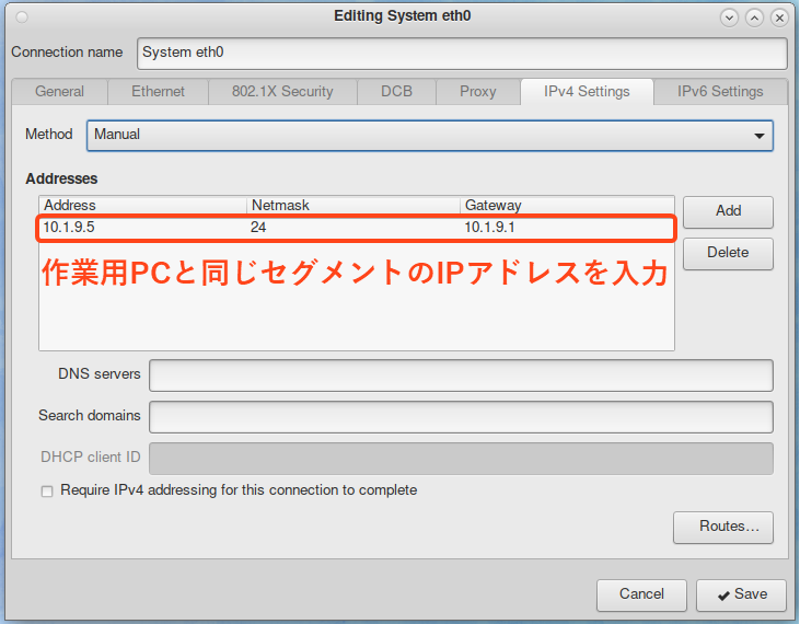 次にFoundation VM内の設定画面で作業用PCと同じセグメントのIPアドレスを割り当てます。![]()