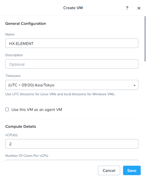 ・Number of VMs:一度に複数の仮想マシンを同時に作成できます。値を2以上にすると、仮想マシン名の末尾に連番 " -n " が付与されます。