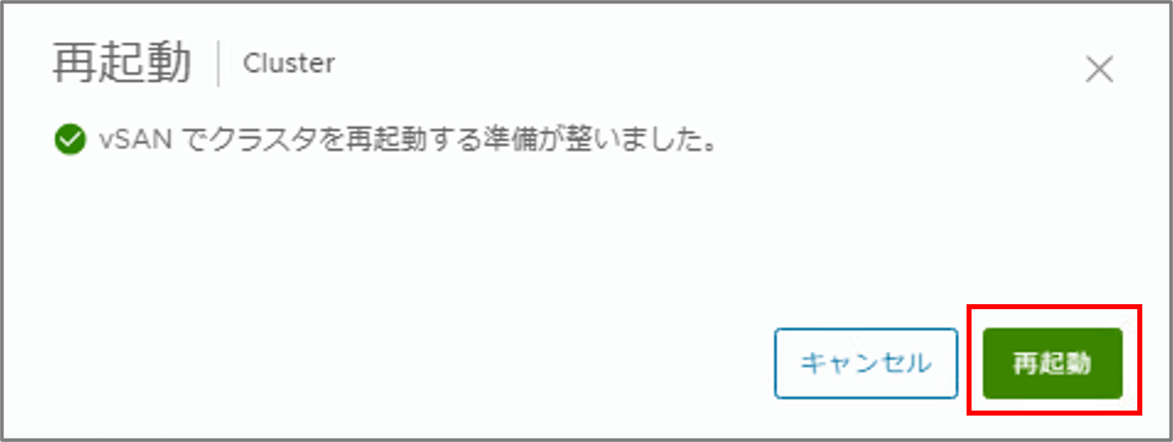 5. ポップアップが表示されます。[再起動] をクリックすると、あらためて再起動されるわけではなく、そのままvSANのサービスが起動されます。