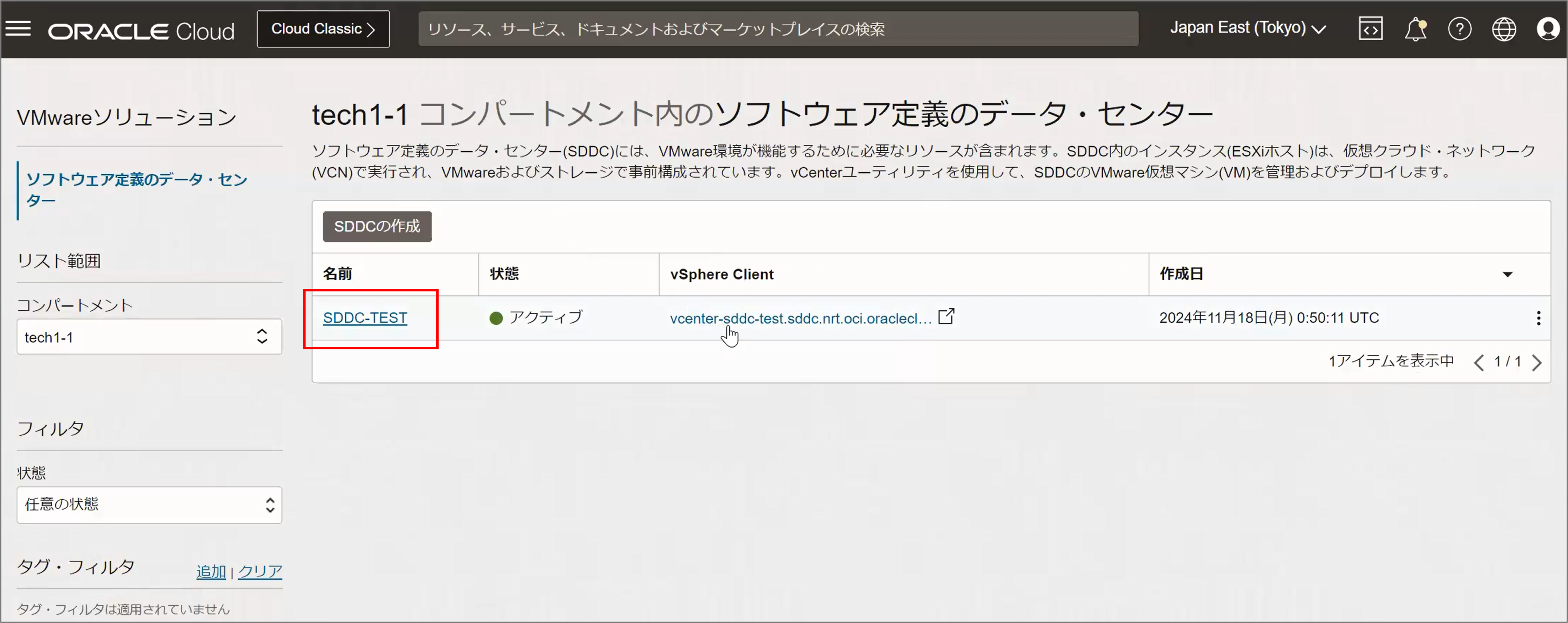SDDCが作成されていますので、「SDDC-TEST」をクリックします。