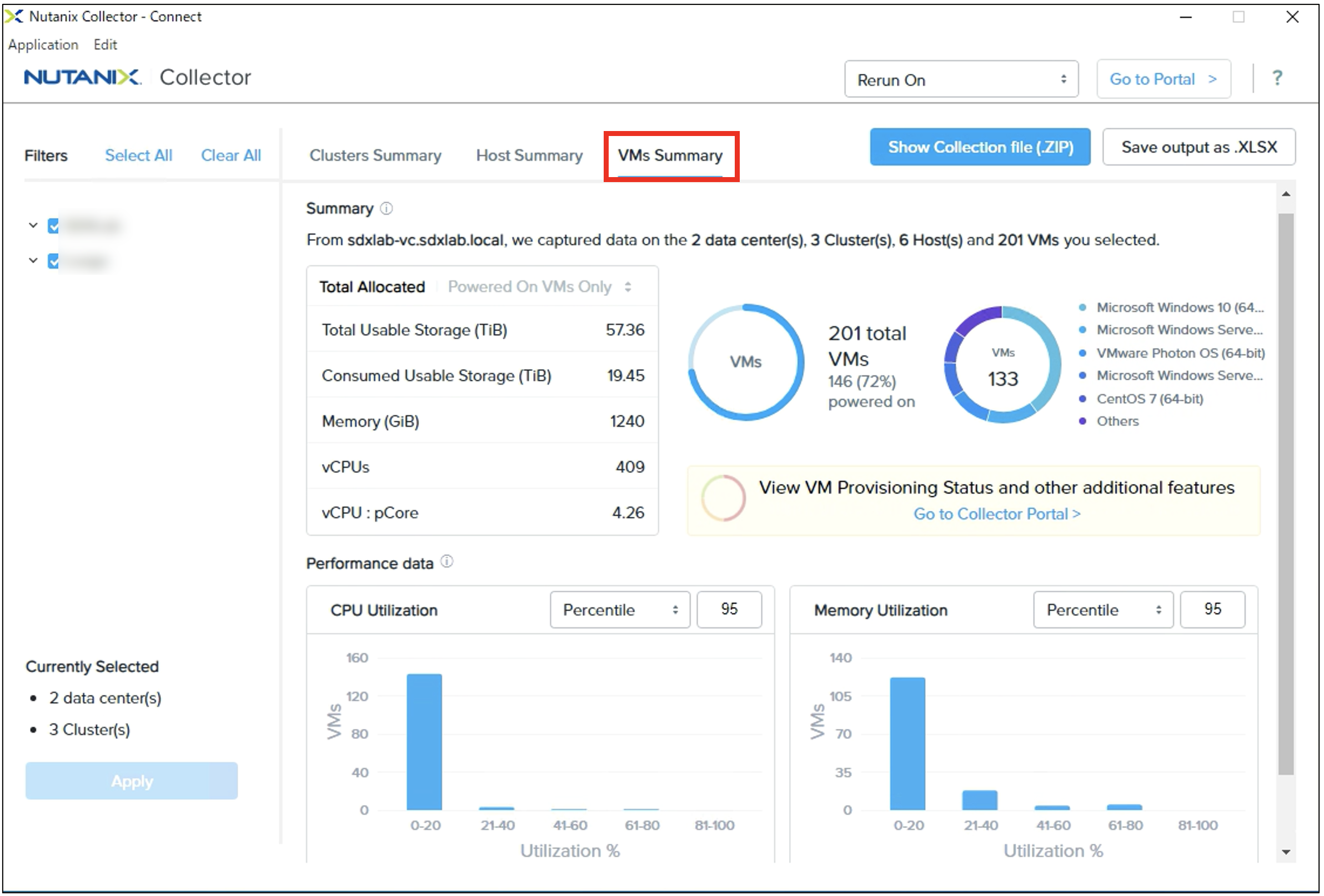 Nutanix CollectorがvCenterへの接続に成功すると、接続したvCenter で管理されているデータセンターやクラスターの情報が表示されます。必要に応じて、データの収集対象にしたいクラスターおよびホストにチェックをいれます。![]()