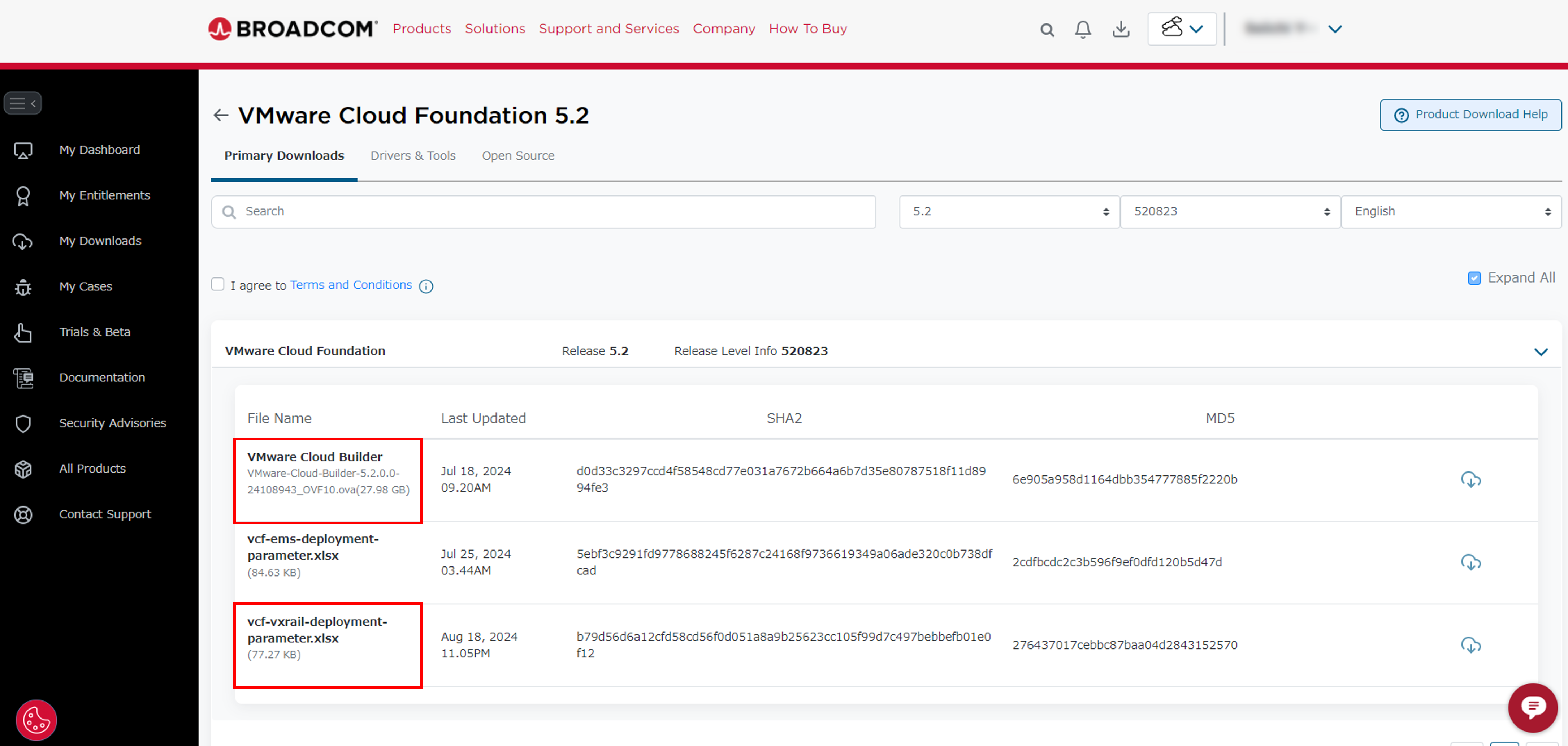 VCF on VxRailを構築するために必要なファイルを、Broadcomのサポートサイトからダウンロードします。必要になるのは「Cloud Builder OVAファイル」「VCF on VxRail用ワークブック」の2点です。Cloud BuilderはVxRail専用ではなく、全てのVCF構築で利用できる仮想アプライアンスです。