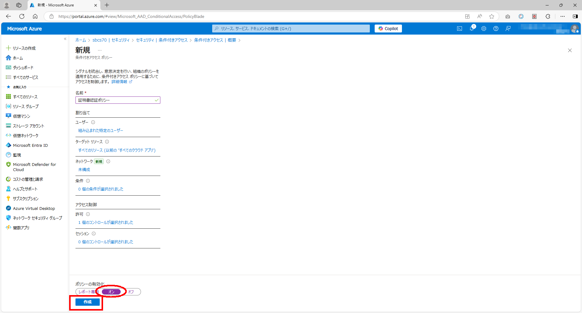 | 4. [ ポリシーの有効化 ] を [ オン ] にして、 [ 作成 ] をクリック