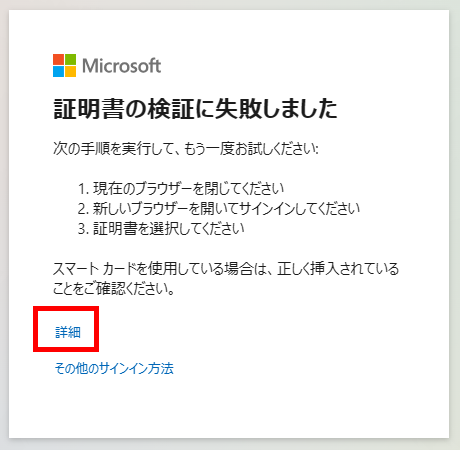 3. 詳細の画面 [ Message : AADSTS1001009 : No value in the certificate , as requested by tenant policy , is able to vaildate the user claim ]