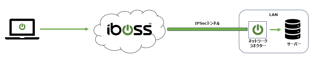 仕組みとしては、ibossに対してIPSecトンネルを確立し、ibossエージェントをインストールした社外端末から企業内部のサーバーへibossとIPSecトンネルを介して、アクセスするものとなっております。
