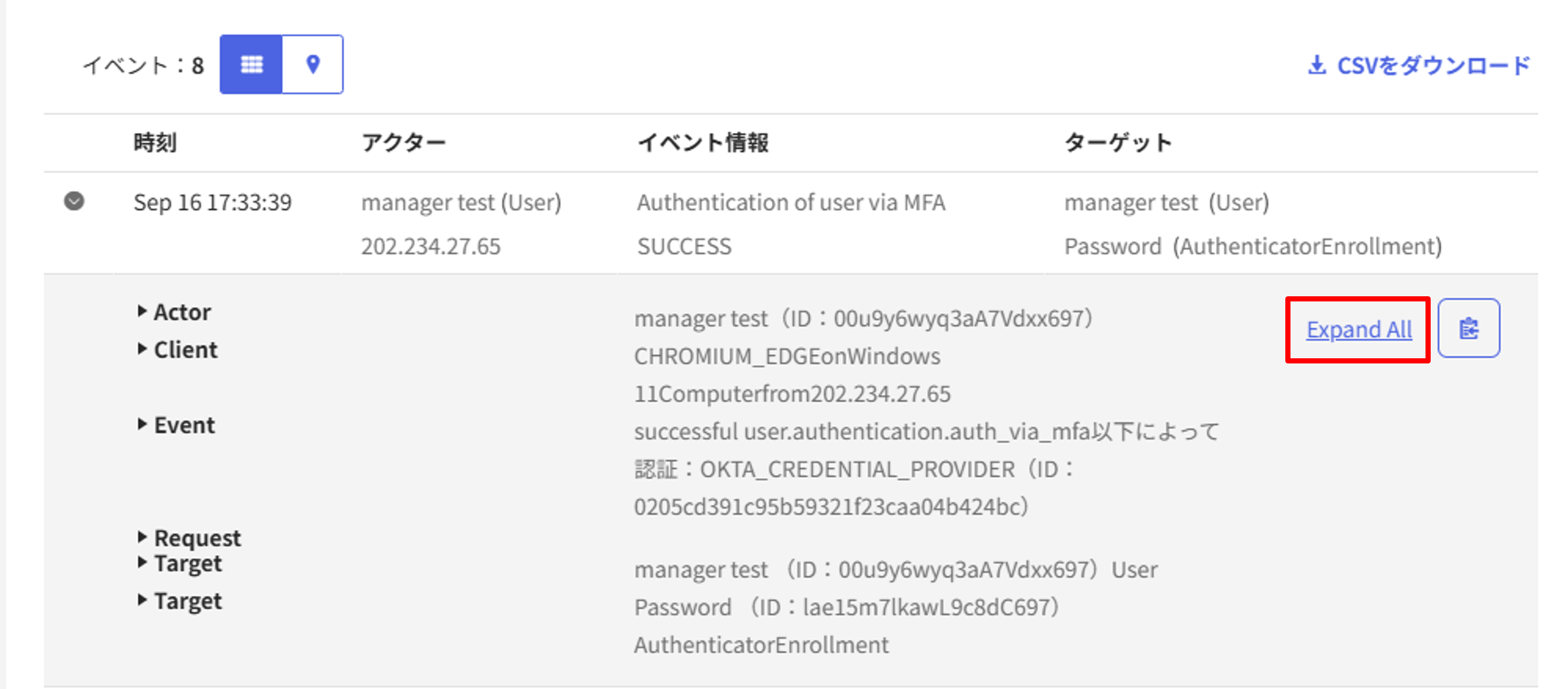 詳細を確認したいときは、各イベントログの左にある矢印マークをクリックして開きます。
