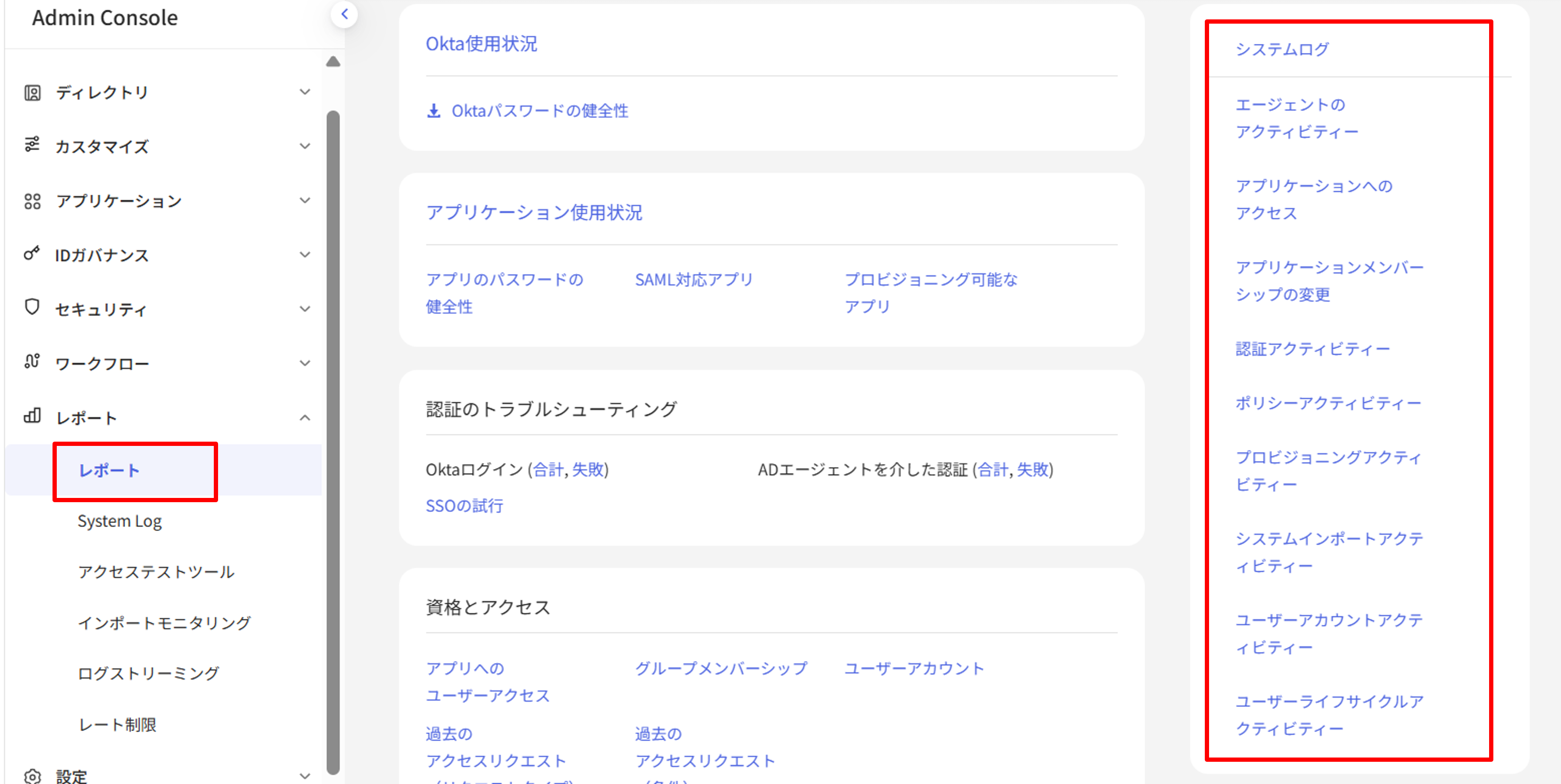 Oktaのログは管理コンソールの[レポート]>[System Log]より確認できます。