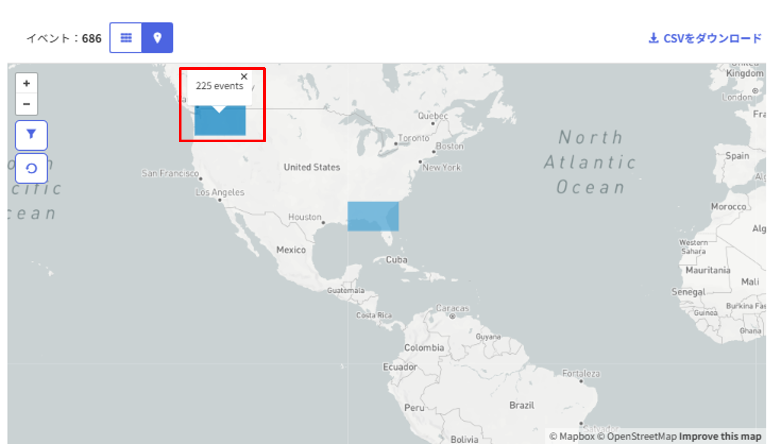 ログのリストビューをマップビューに切り替えると世界地図が表示され、そこからログを絞り込むことも可能です。