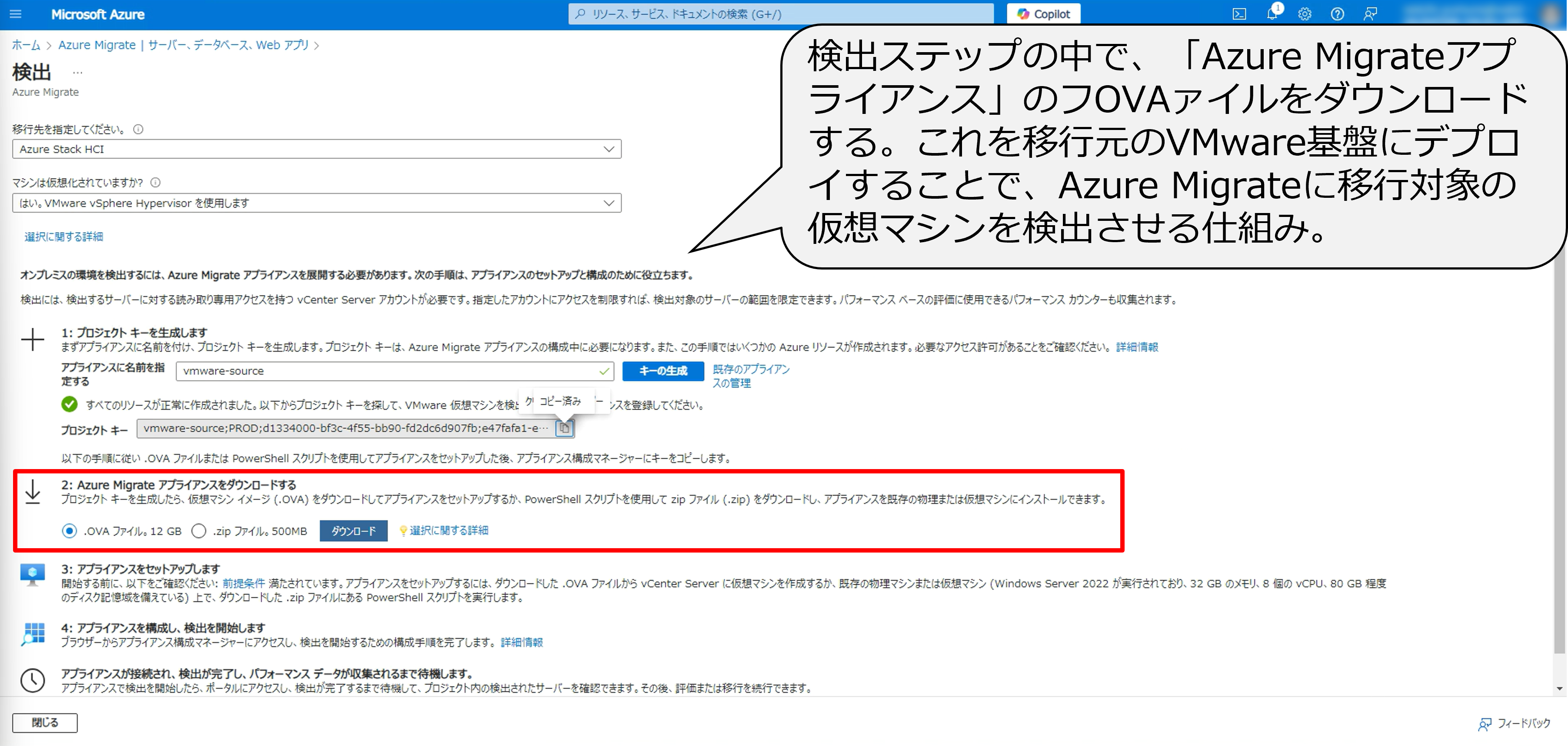 検出ステップを開始すると、「Azure Migrateアプライアンス」のOVAファイルをダウンロードできます。これを移行元のVMware基盤上でテンプレートデプロイを実行し、セットアップを行います。