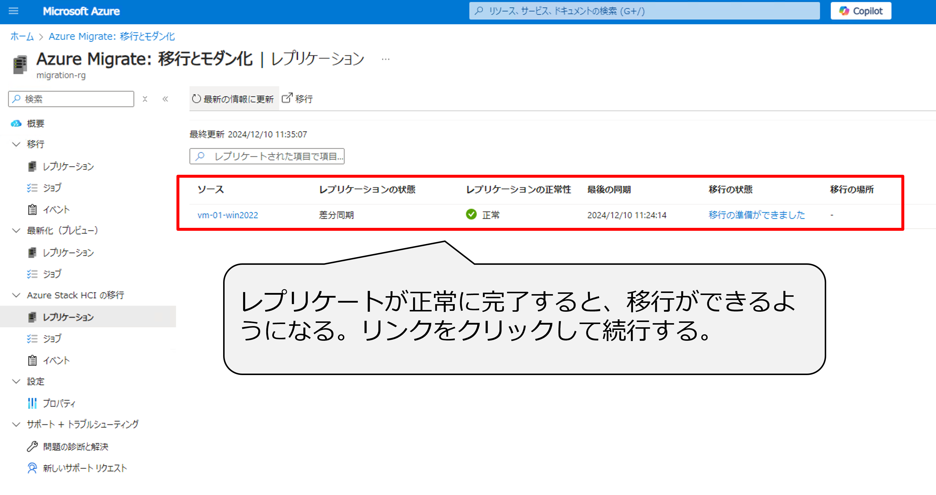 レプリケートが完了すると、移行ができる状態になります。リンクをクリックして移行ステップを実行します。