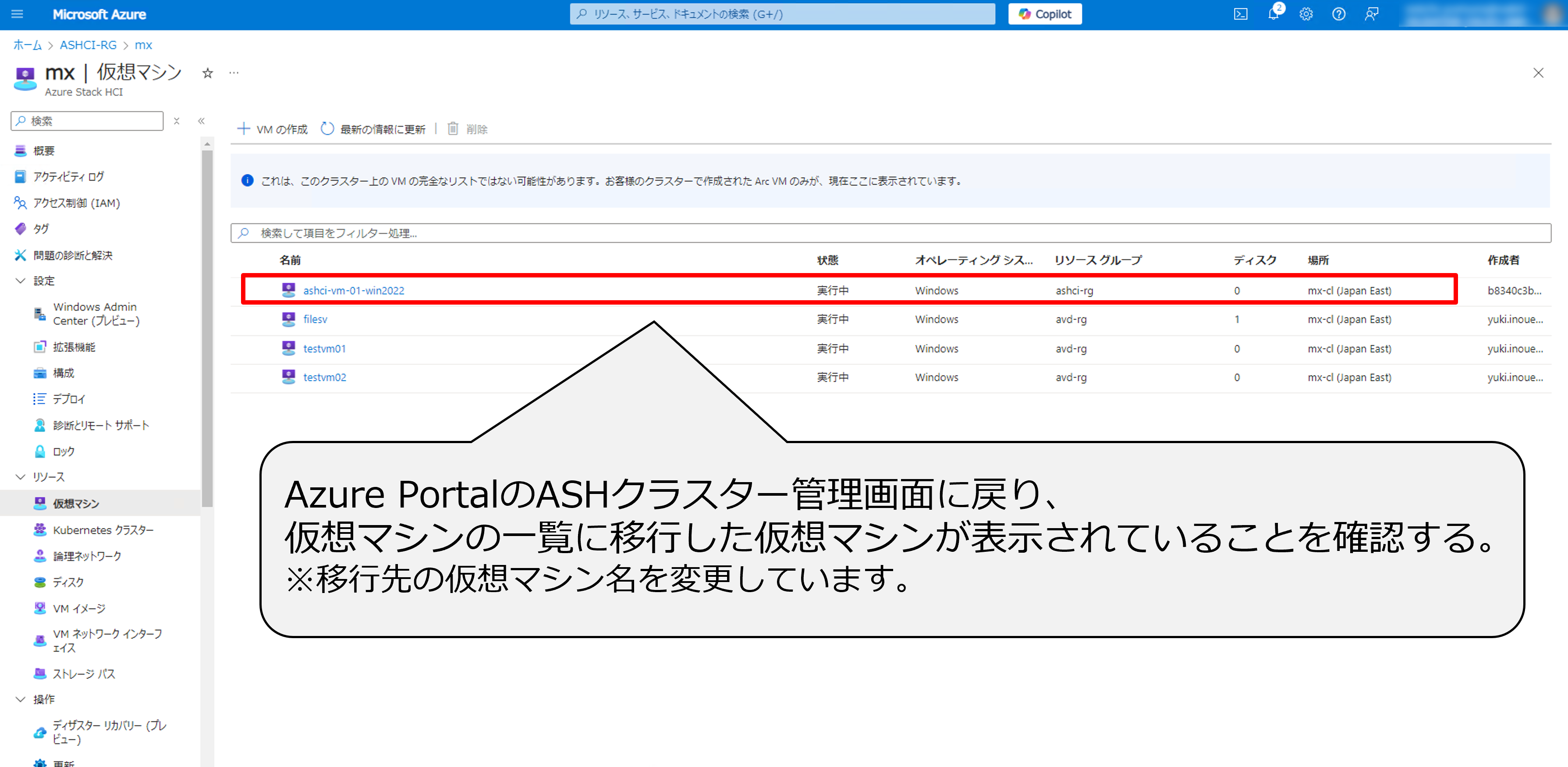 Azure Local上で稼働する仮想マシンの実体はあくまでオンプレミスのサーバー上にあります。しかし、Azure Arcと呼ばれる、オンプレミスのリソースをAzure側に投影する技術によって、オンプレミスの仮想マシンがあたかもAzure上で稼働してるかのように管理できます。つまり、移行した仮想マシンがAzureから認識できているということは、移行しただけで自動的にAzure Arc対応の仮想マシン「Azure Arc VM」として有効になっているということです。s![]()