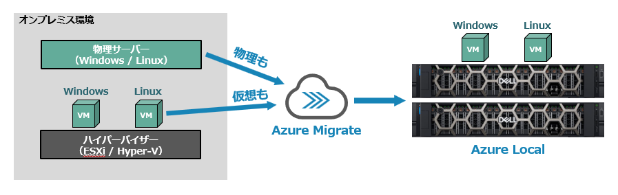 Azure Migrateは、Microsoft純正の無償移行ツールです。オンプレミスの物理環境も仮想環境も全てAzureへ簡単に移行できます。Azure LocalはAzureと接続するソリューションであるため、Azure Localへの移行についてもAzure Migrateを利用できます。