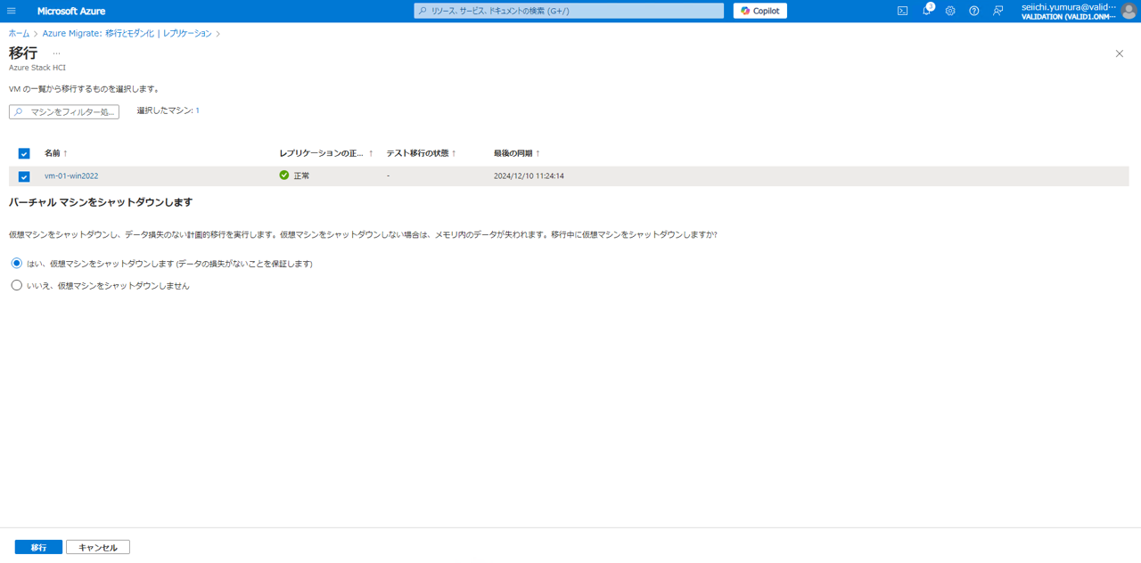 移行を実行する前に、移行対象の仮想マシンへシャットダウンを指示することができます。事前に手動でシャットダウンするのを忘れていたとしても、Azure側で制御できるのがいいですね!