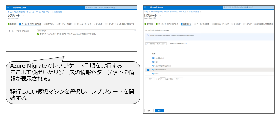 ここまで、移行元・移行先両基盤の検出が完了した状態です。いよいよレプリケートを行います。プロジェクト内の移行ツールを起動し、ウィザードの指示に従って必要事項を入力します。移行したい仮想マシンは1台でも複数台まとめてでもレプリケートできます。