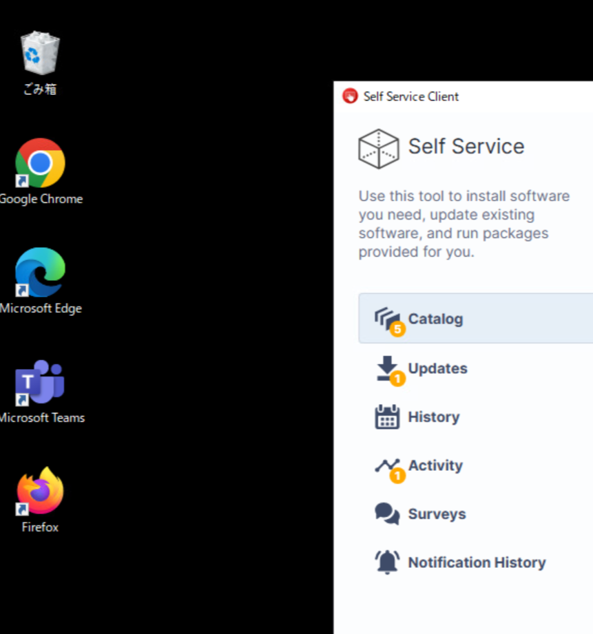 PC上でクライアントのウィンドウを開けば、管理者が登録しているアプリケーションを環境にインストールしたり更新したり削除したりできる機能です。