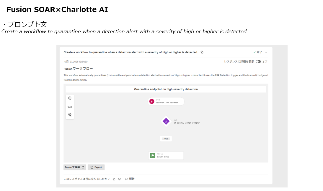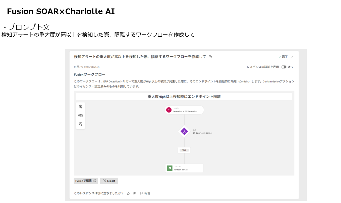 今回は、活用記事でも紹介したエンドポイント検知において、セキュリティ重大度が"高"以上のアラートを検知した際に端末隔離を実施するアクションをCharlotte AIに作成してもらうよう質問してみます。