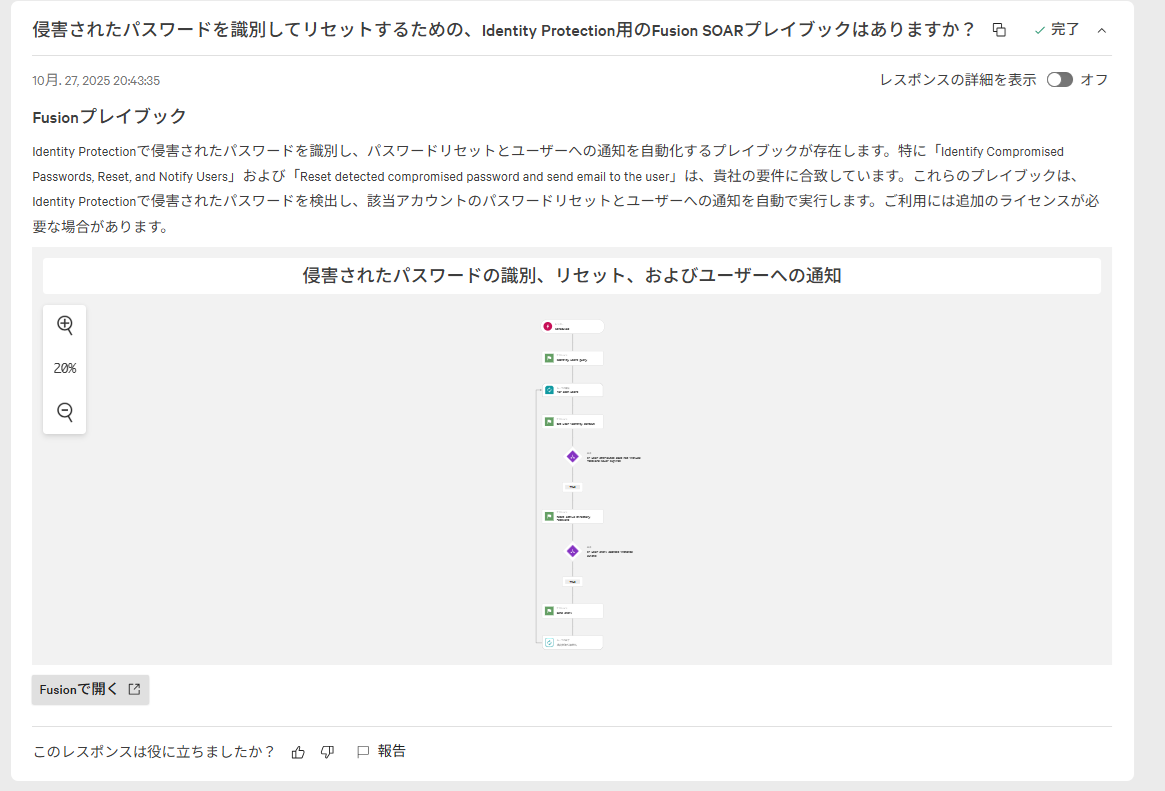 以下、例となりますがFalcon ITPにて「侵害されたパスワードを識別してリセットするための、Identity Protection用のFusion SOARプレイブックはありますか?」とCharlotte AIに質問すると、既に存在しているプレイブックから回答してくれます。