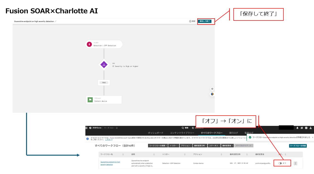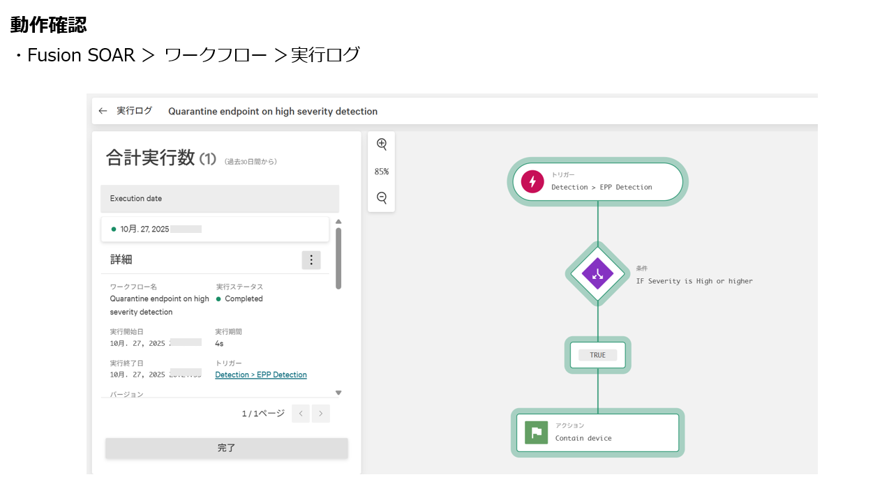 Fusion SOARの実行履歴を見てみましょう。「監査ログ」からワークフローが実行されていることが確認できました。これにより、Charlotte AIで自然言語で作成したワークフローが正常に実行されたことが確認できました。