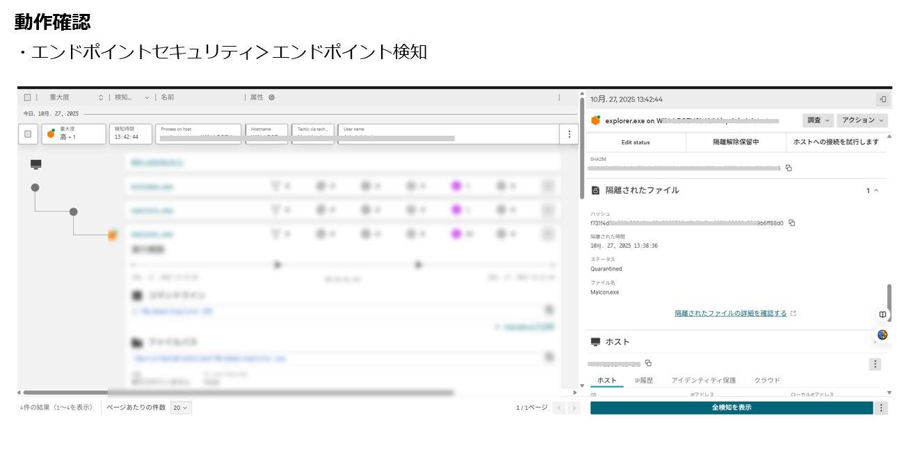 エンドポイント検知にて重大度"高"で検知したことが確認できました。