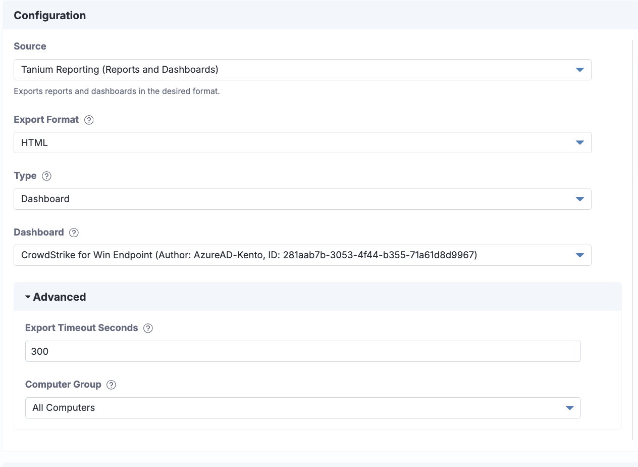 Tanium Reporting(Reports and Dashboard):Tanium Data Serviceによって収集されたデータからカスタムレポートとダッシュボードをエクスポート。HTML ファイルを宛先に送信。