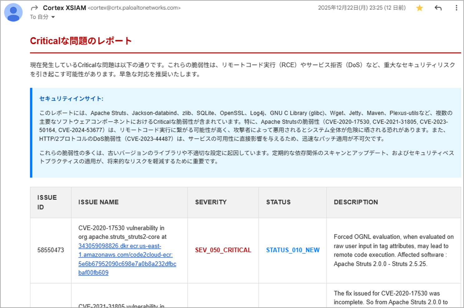 するとCriticalな問題の件数と併せて、自動で要約もして情報を出してくれました。こういった + α の情報を付け加えてくれるのもAIならではです。