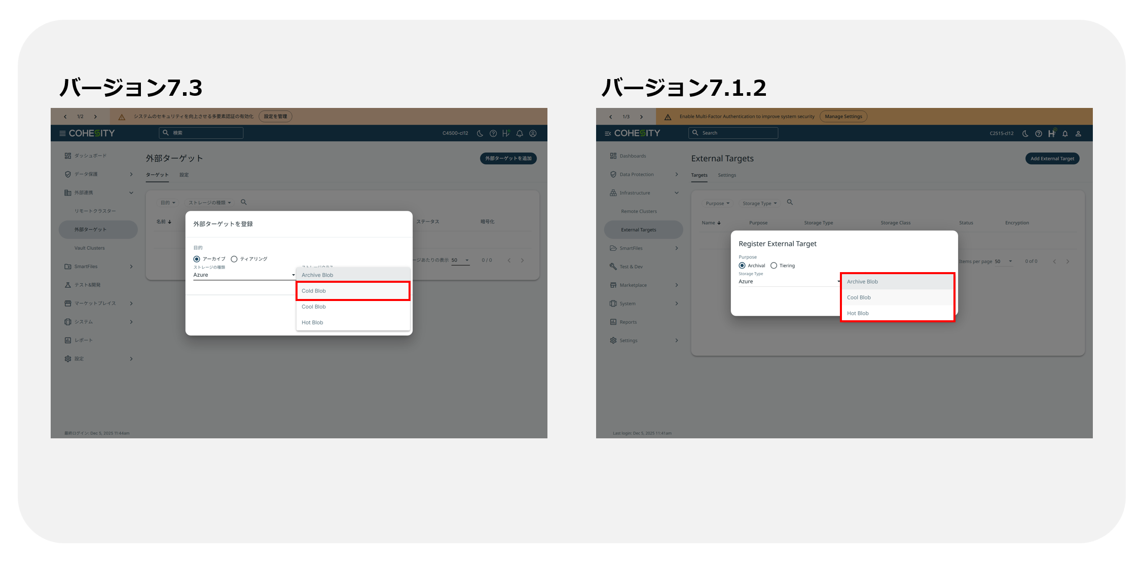 バージョン7.1.2ではアーカイブ先の外部ターゲットとしてAzure環境ではArchive BlobとCool BlobそしてHot Blobがサポートされており登録可能でしたが、新たにバージョン7.3よりCold Blobがサポートされました。登録することでアーカイブ先としてCold BlobへデータをCloudArchiveすることが可能になります。![]()